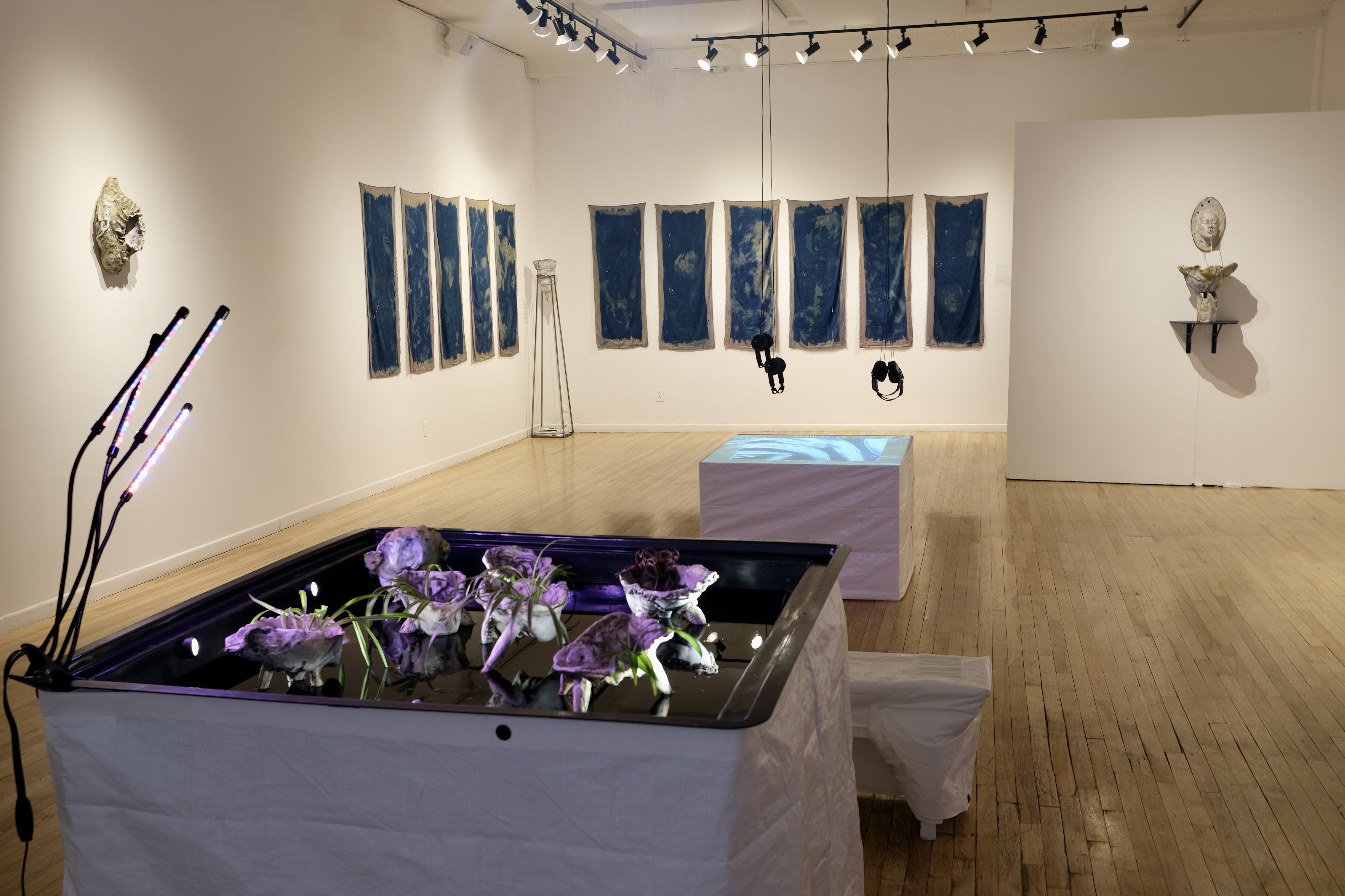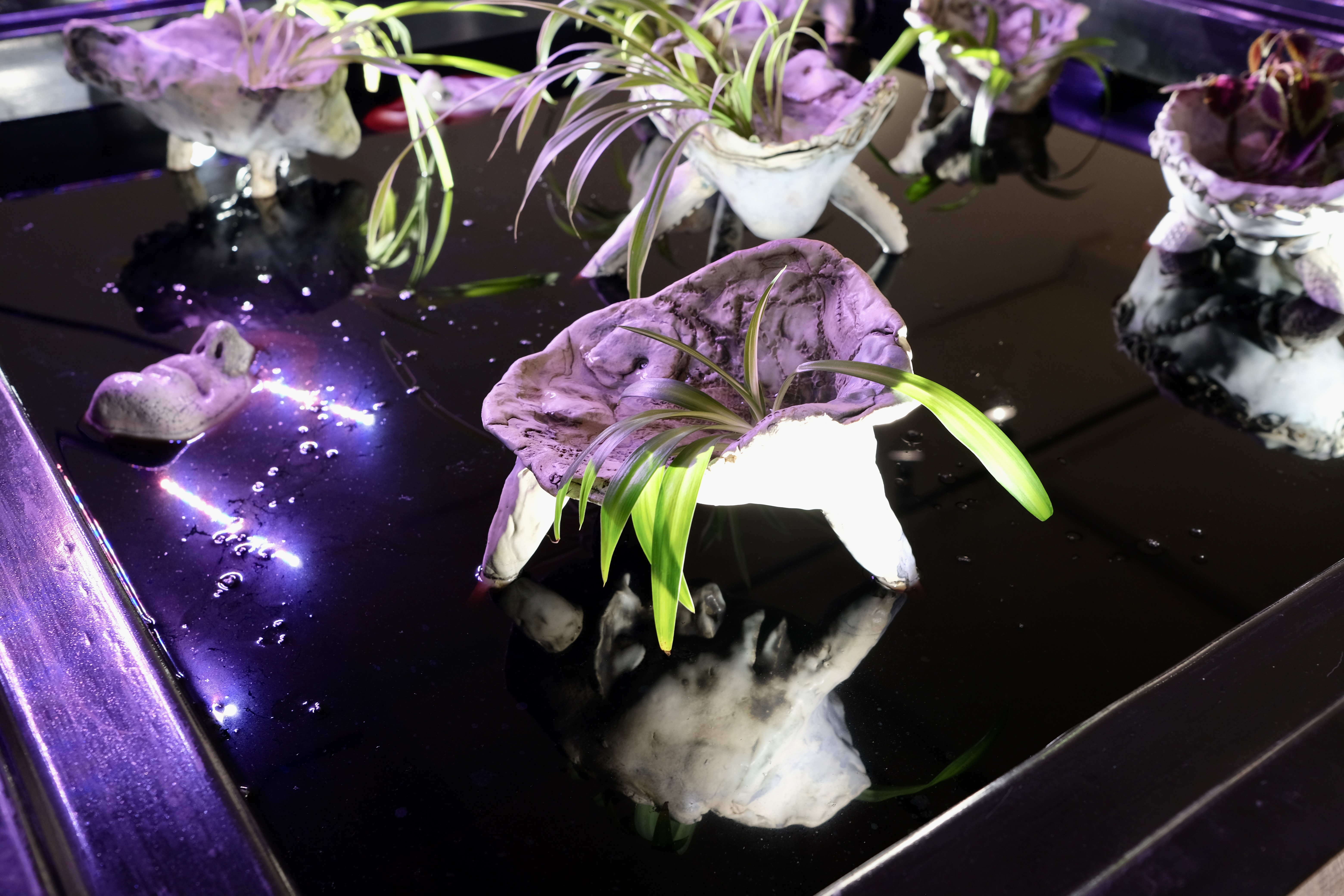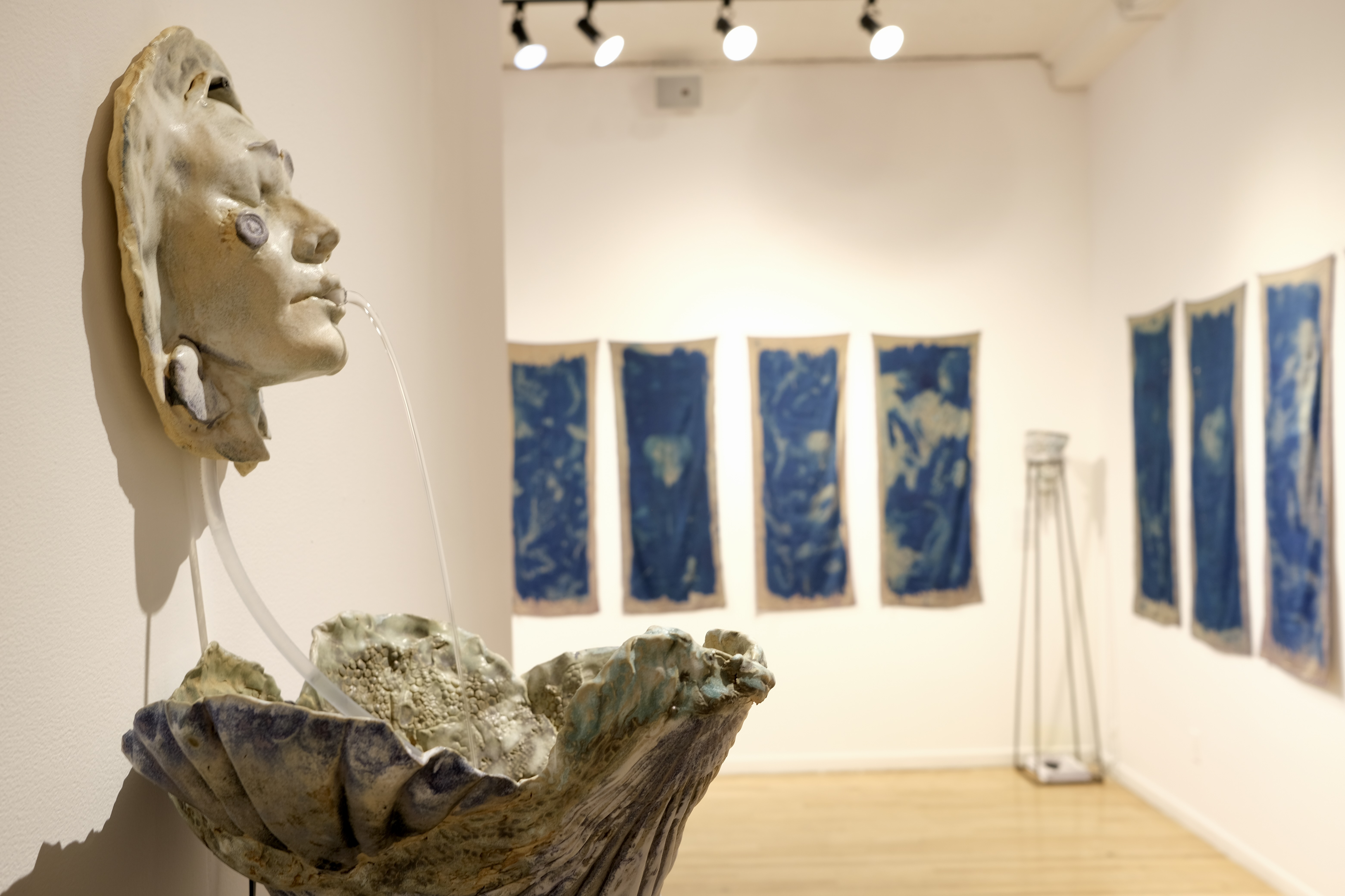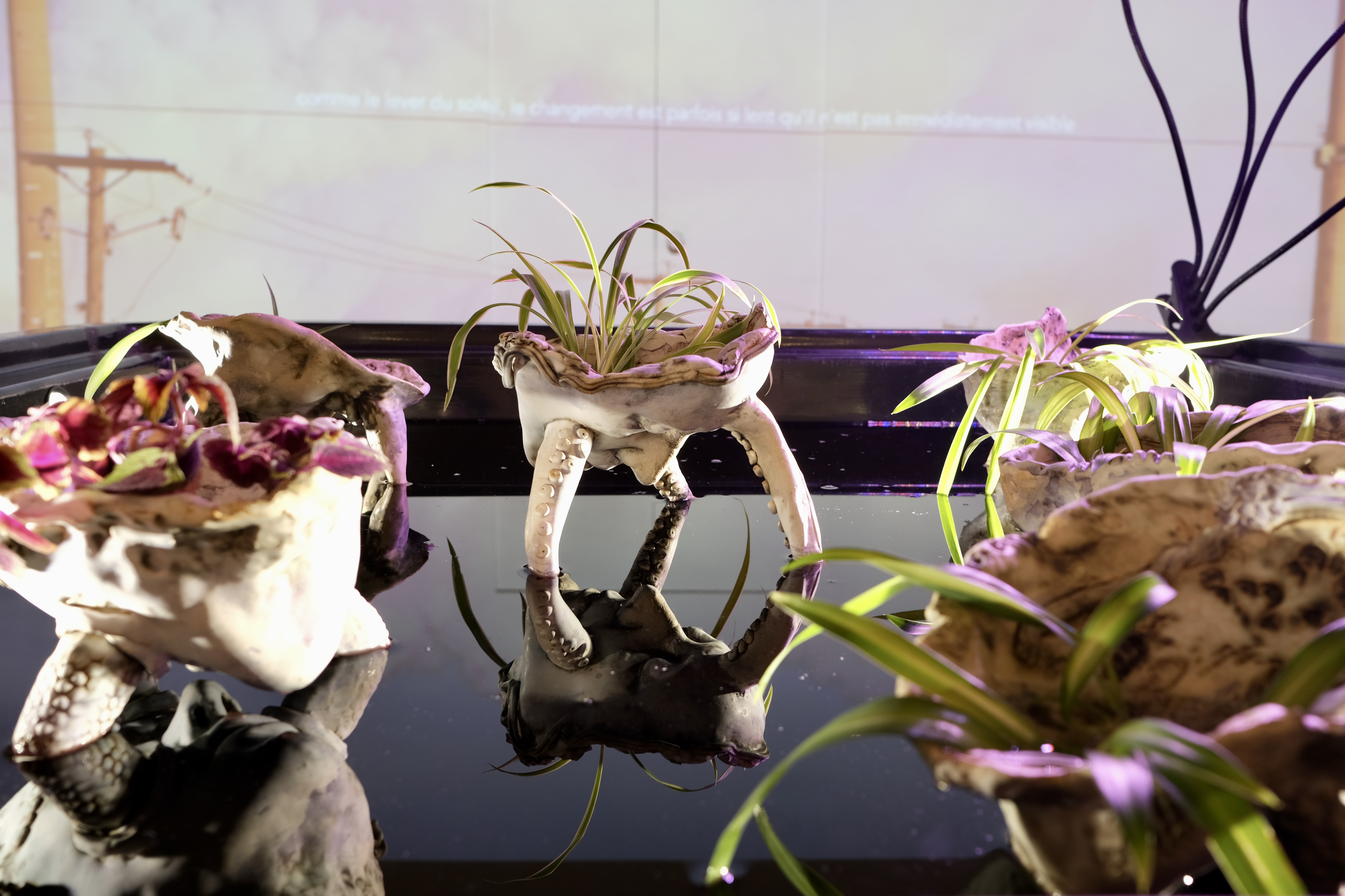 Dans une installation pluridisciplinaire où des fontaines anamorphiques annoncent un avenir aquatique, des visages de glace font écho au mythe de Narcisse et des gargouilles de céramique évoquent la chaîne radioactive de l’uranium, des réflexions sur la crise écologique et la violence environnementale émergent.